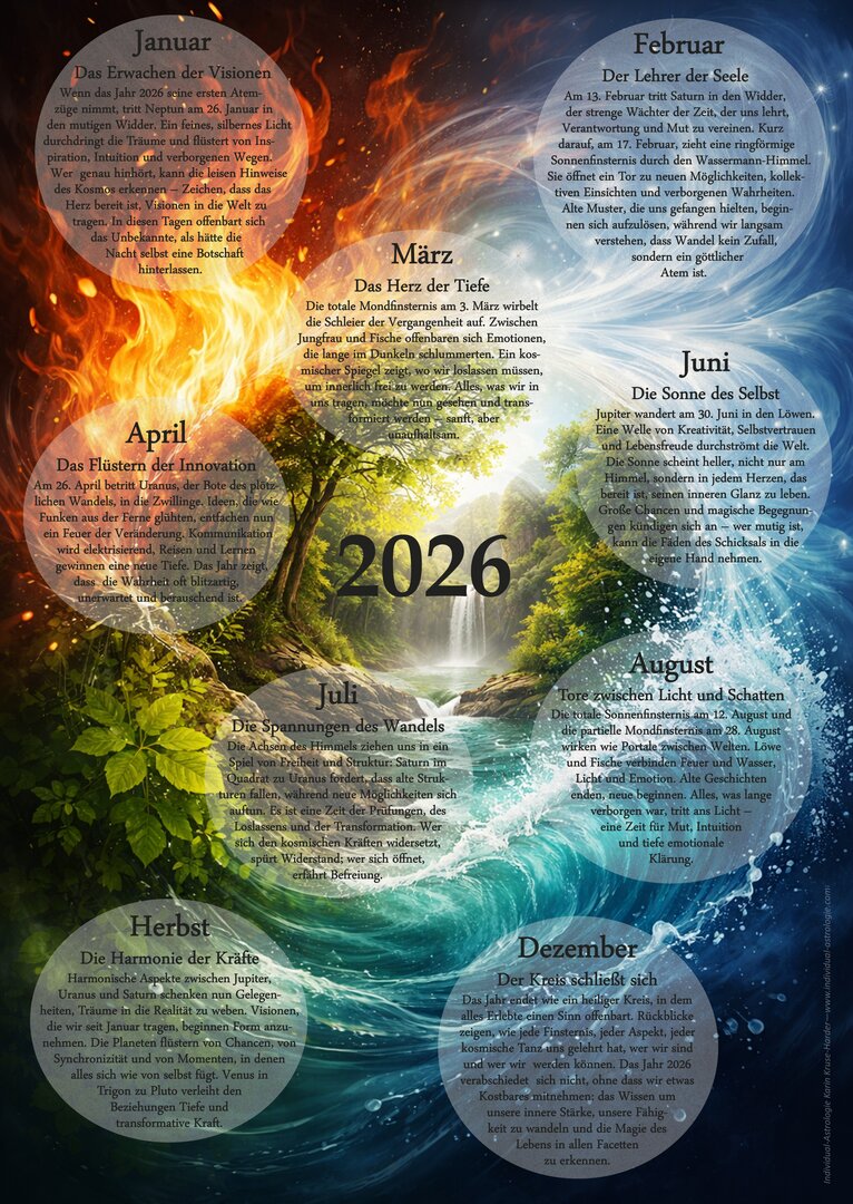Die Kräfte des Himmels bewegen sich, rufen uns zurück zu uns selbst. Verborgene Dinge werden sanft berührt, Altes beginnt zu weichen. Wer aufmerksam lauscht, öffnet das Tor – und betritt den Weg der Erneuerung.